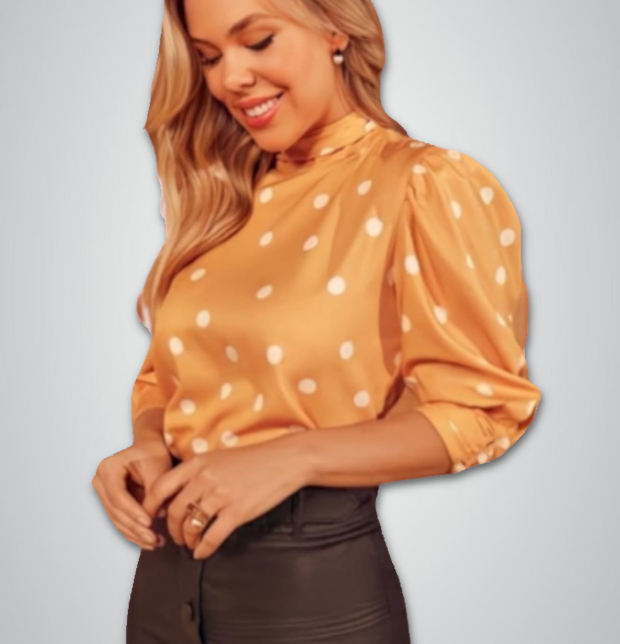 Blusa Feminina da marca Via Tolentino confeccionada em Viscose com toque acetinado com textura discreta. Possui estampa de poá, mangas 3/4 com leve bufante, abotoamento em botões perolados e franzido no punho, gola alta com amarração na parte de trás com regulagem ampla. Composição: 92% Poliéster | 8% As cores das fotos podem variar de acordo com a configuração do seu monitor, bem como as condições de iluminação do estúdio fotográfico. ** Os acessórios utilizados na produção das fotos não acompanham o produto.
