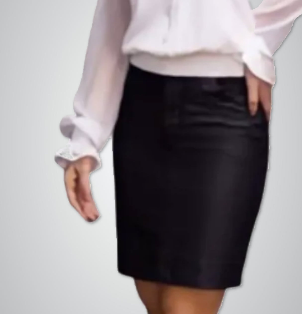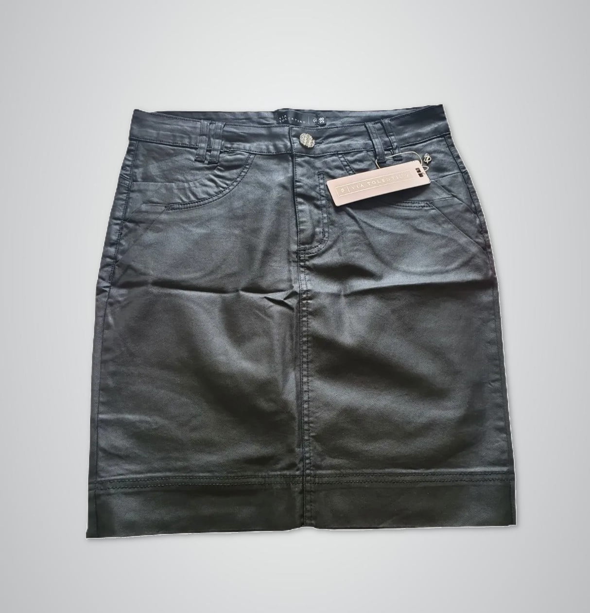 Dicas de ocasião de uso: O resinado possui aparência semelhante ao couro, porém oferece maior conforto e veste super bem, além de tornar o look sofisticado. Você pode combinar com blusas, que deixarão a composição mais informal, já camisas proporcionarão mais seriedade. É possível optar tanto por peças lisas quanto estampadas. Para quem gosta de looks combinandinhos, é indicado escolher estampas que contenham elementos da cor da saia, assim o look ficará ainda mais harmônico.