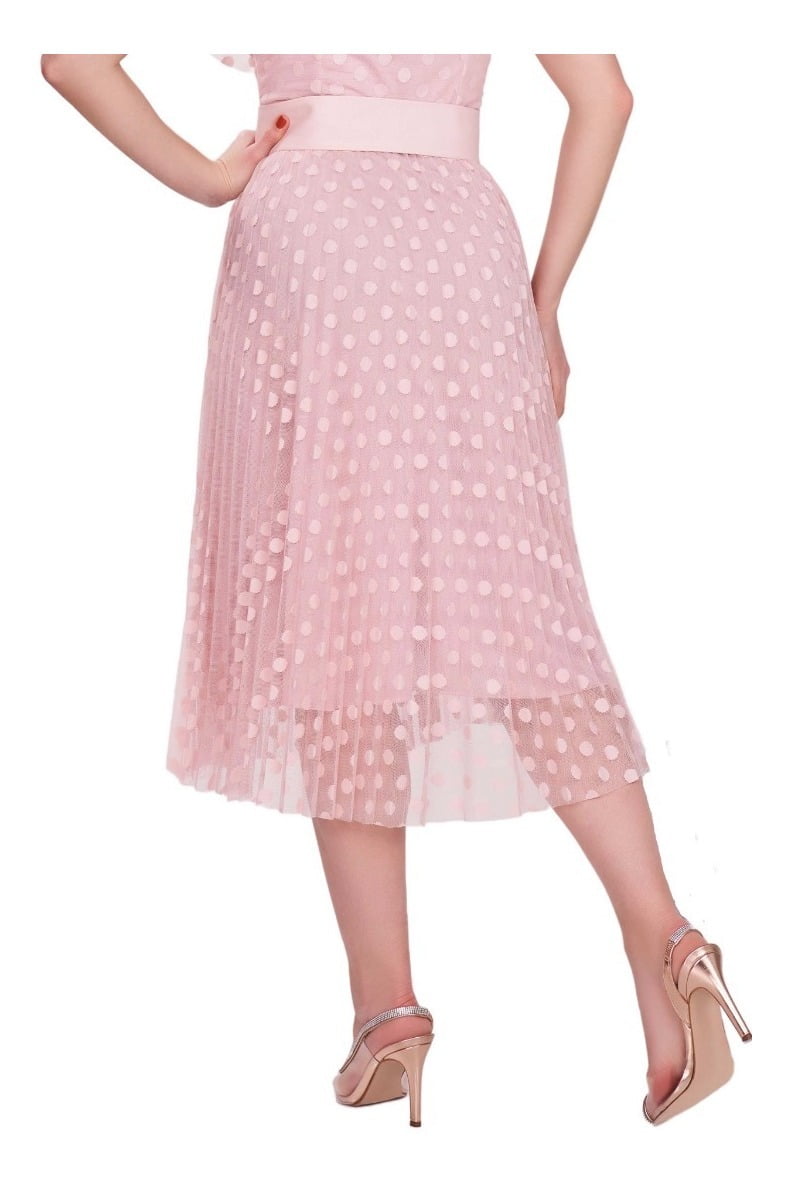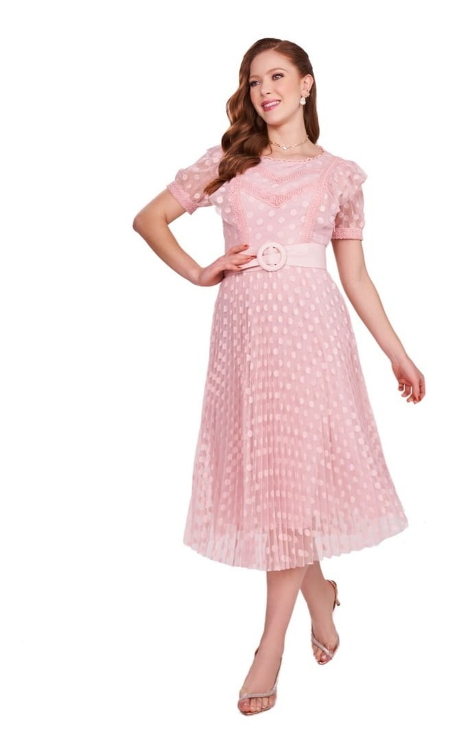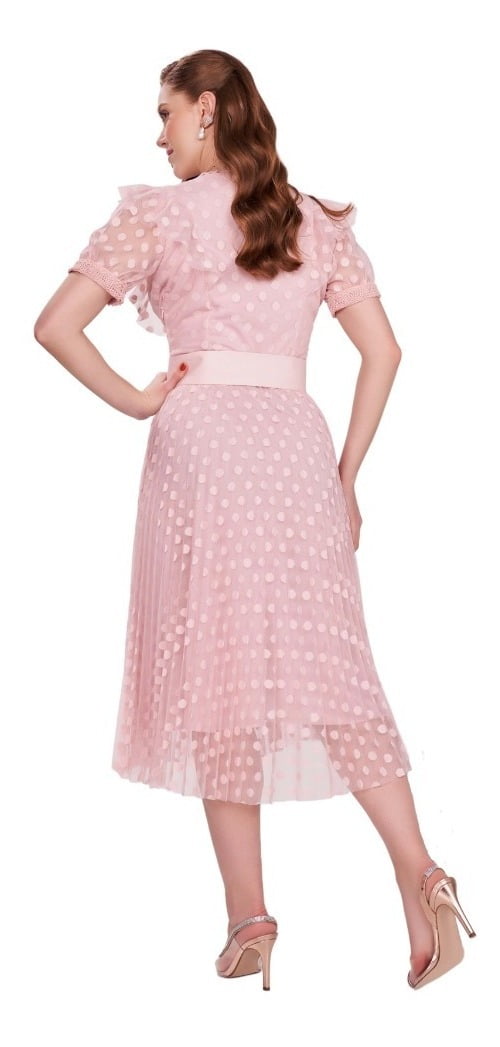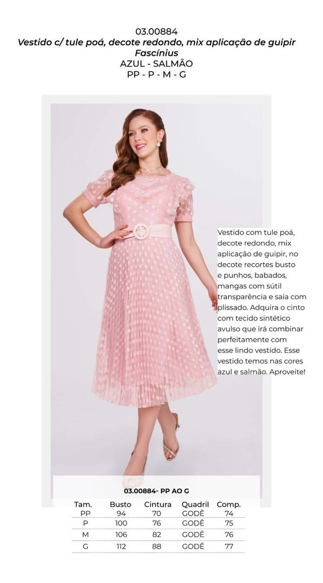 Vestido com tule poá, decote redondo, mix aplicação de guipir, no decote recortes busto e punhos, babados, mangas com sútil transparência e saia com plissado. Adquira o cinto com tecido sintético avulso que irá combinar perfeitamente com esse lindo vestido. Esse vestido temos nas cores azul e salmão. Aproveite! ACOMPANHA O CINTO